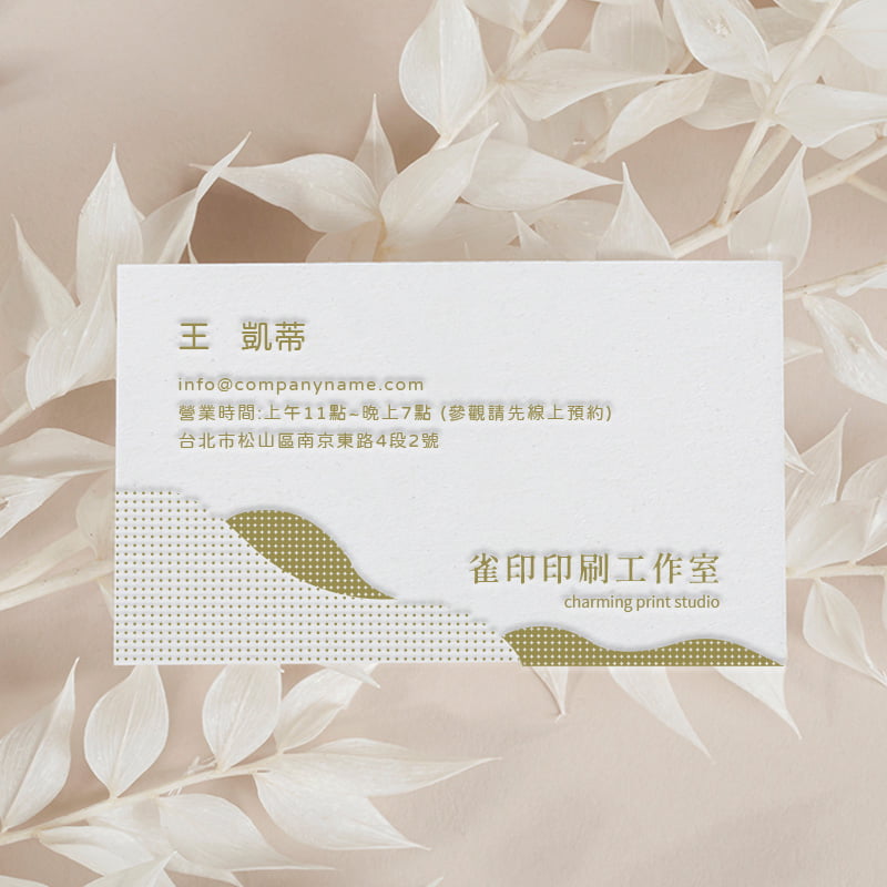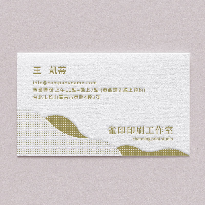 以凸板印刷印製的名片,採用300gsm 凸版專用棉紙,質地厚實觸感柔軟,多種墨色可選。印刷處因壓力可能產生些許凹陷。