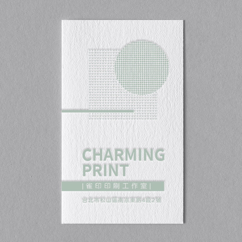 以凸板印刷印製的名片,採用300gsm 凸版專用棉紙,質地厚實觸感柔軟,多種墨色可選。印刷處因壓力可能產生些許凹陷。