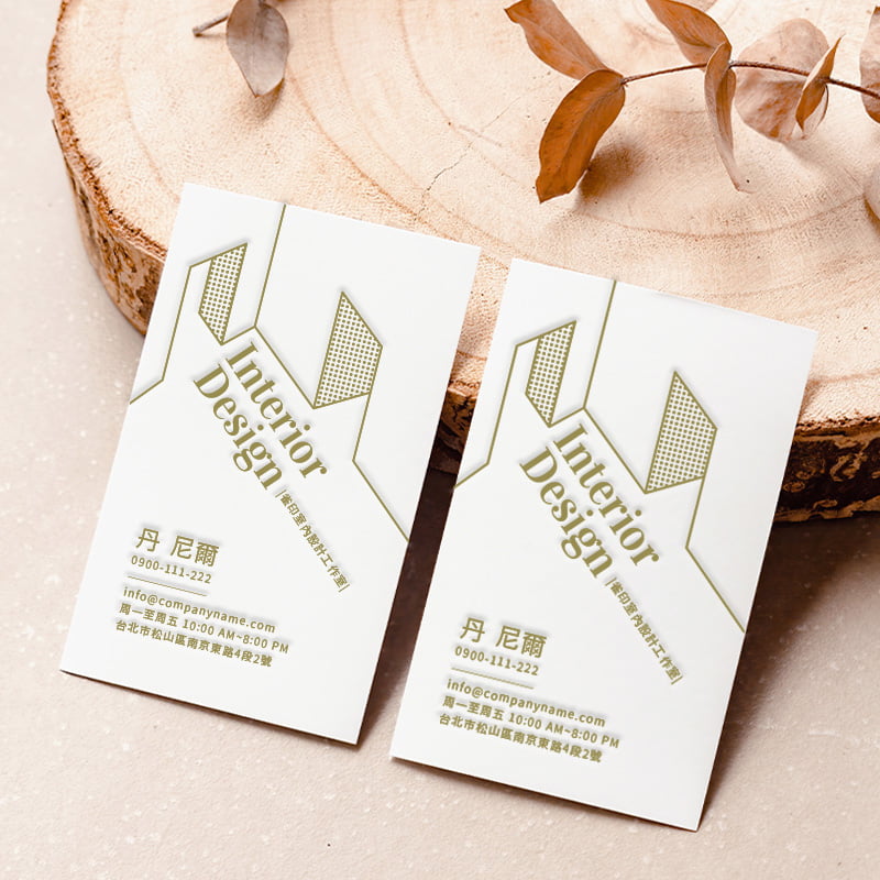 以凸板印刷印製的名片,採用300gsm 凸版專用棉紙,質地厚實觸感柔軟,多種墨色可選。印刷處因壓力可能產生些許凹陷。