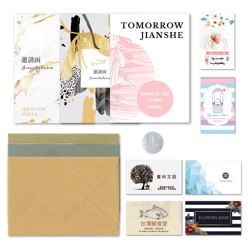 • 邀請函紙樣各一: 一級卡250g/象牙卡220g/萊妮220g/象牙卡270g/雙霧250g/雙亮250g/雪銅300g