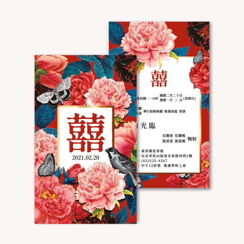 彩色雙面喜帖,精選多樣設計,自由編輯內容,線上製作所見即所得,多種優質紙材選擇,精湛台灣在地印刷,無可比擬的絕佳性價比