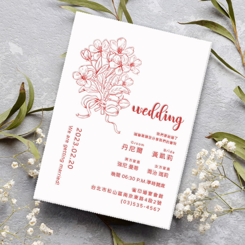 以凸板印刷印製的喜帖,採用300gsm 凸版專用棉紙,質地厚實觸感柔軟,多種墨色可選。印刷處因壓力可能產生些許凹陷。