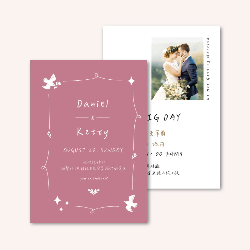 彩色雙面喜帖,精選多樣設計,自由編輯內容,線上製作所見即所得,多種優質紙材選擇,精湛台灣在地印刷,無可比擬的絕佳性價比