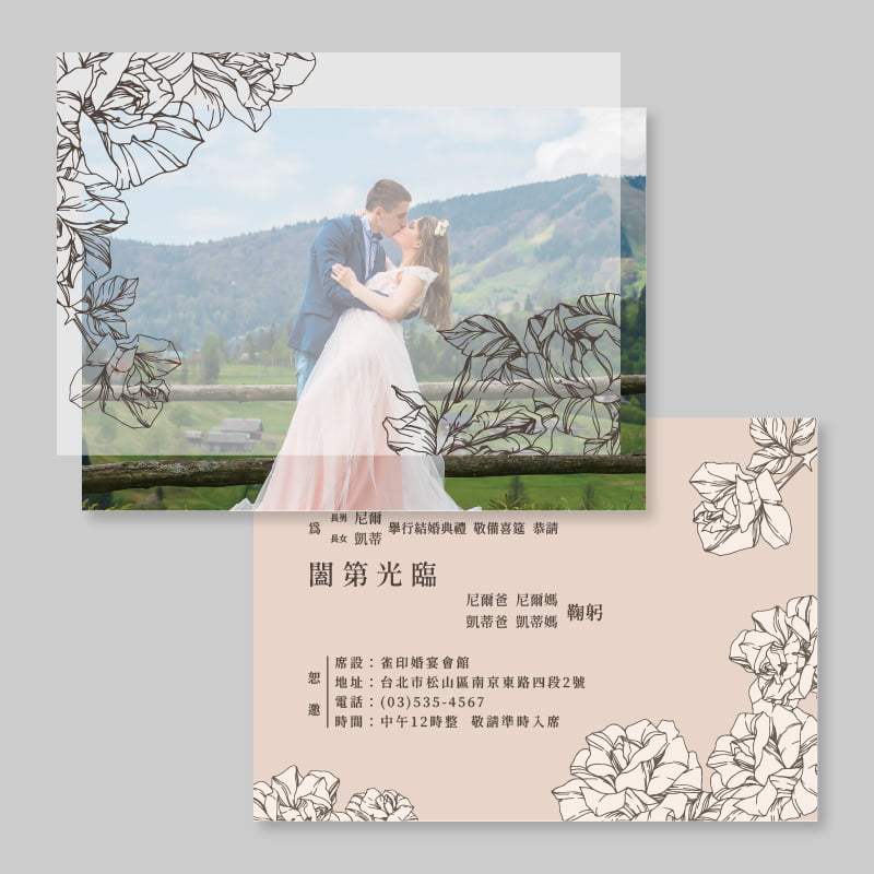 喜帖與半透明描圖紙的浪漫組合,含年輕可愛水滴型迴紋針,若隱若現的質感讓喜帖與眾不同。