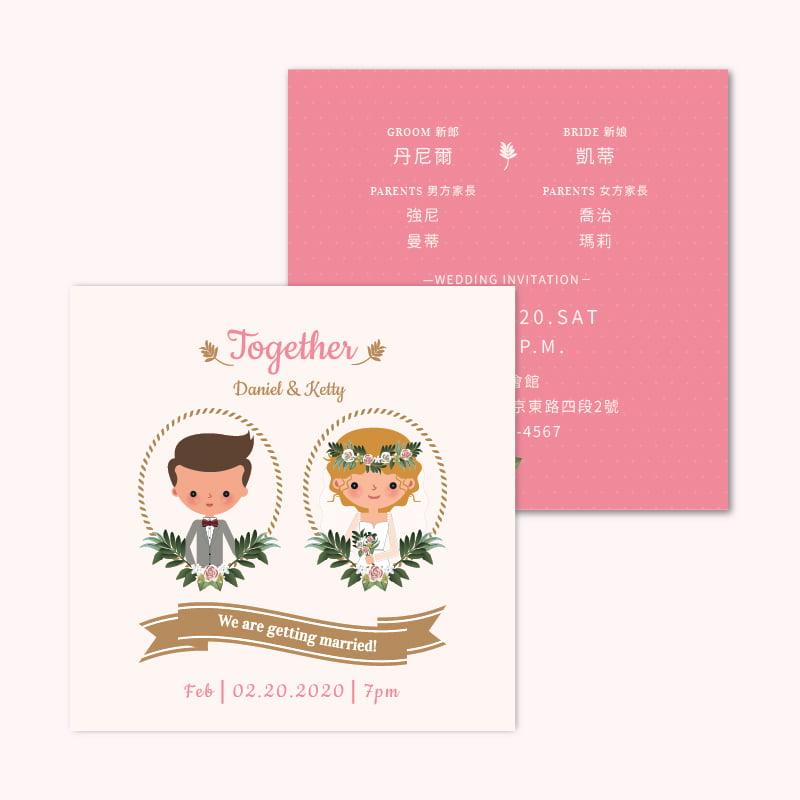 彩色雙面喜帖,精選多樣設計,自由編輯內容,線上製作所見即所得,多種優質紙材選擇,精湛台灣在地印刷,無可比擬的絕佳性價比